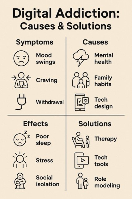 Digital addiction is a modern challenge—but it’s one we can overcome. By understanding its causes and effects, and by adopting practical strategies like therapy, tech boundaries, and family engagement, we can build healthier relationships with technology.